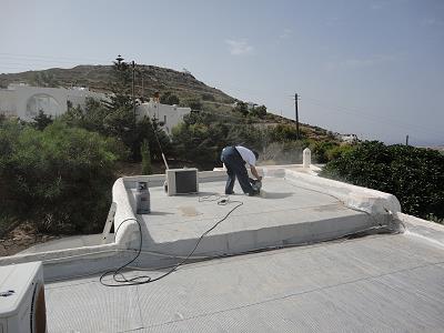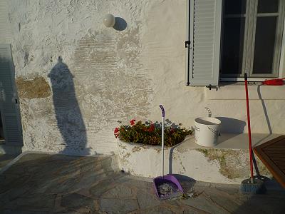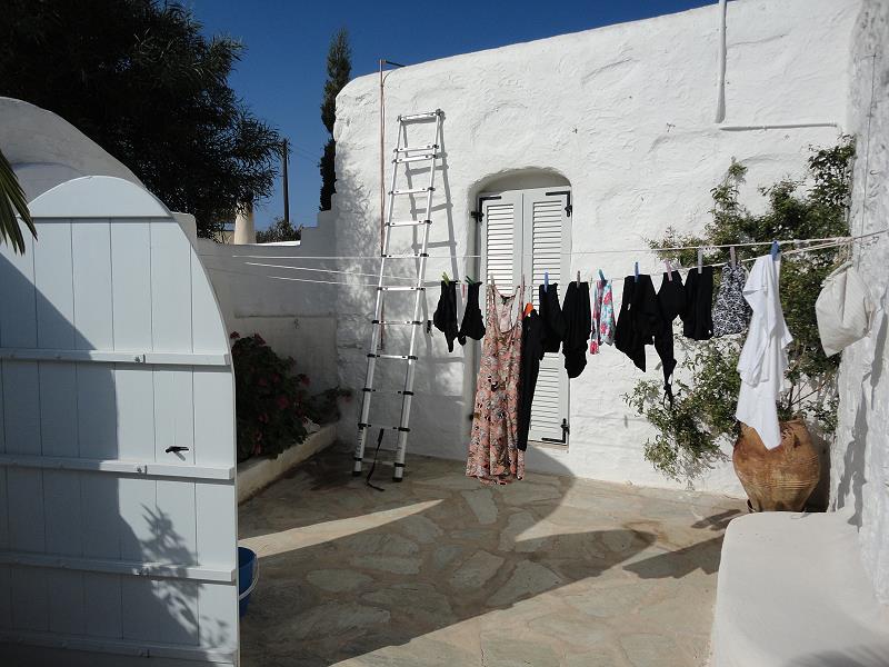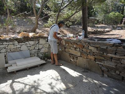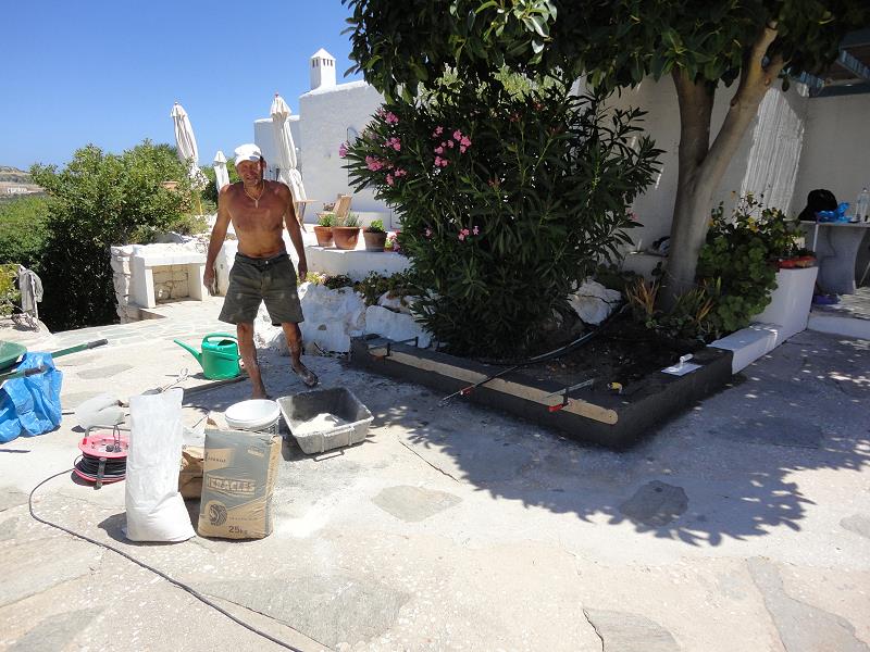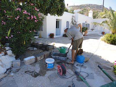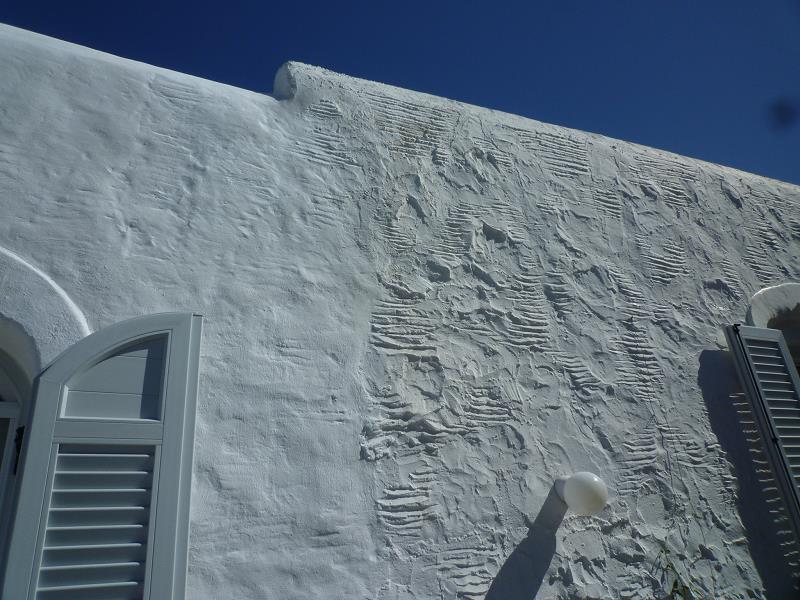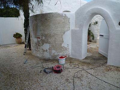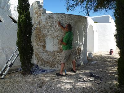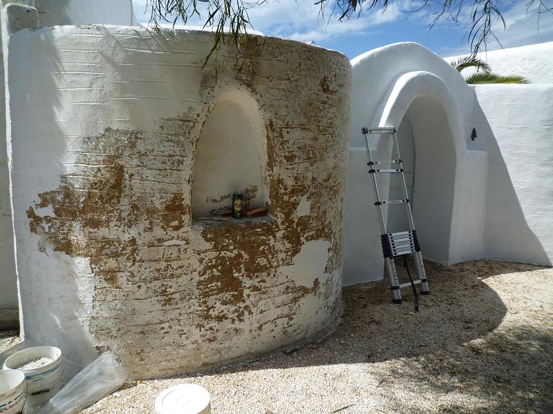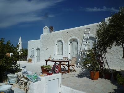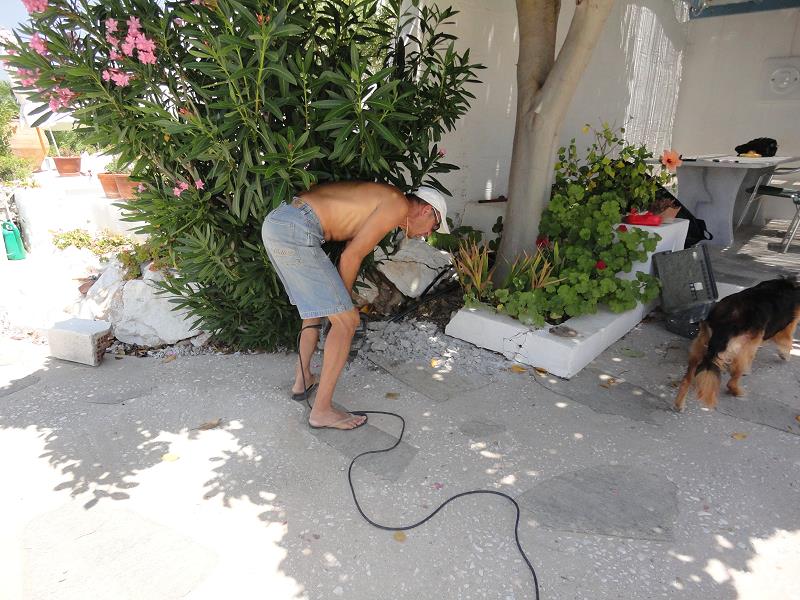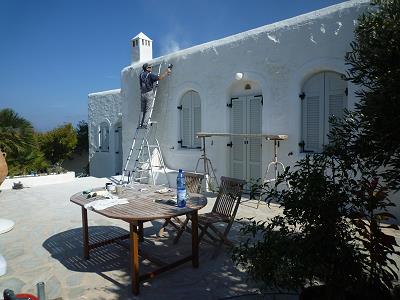 LEERE STRÄNDE, IMMER NOCH WARMES MEER! MIT STEFANOS BEGINNT ABER GLEICH DIE ARBEIT: FASSADENSCHLEIFFEN