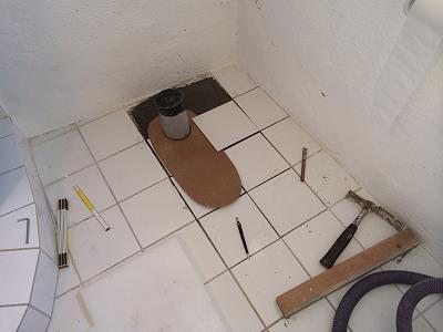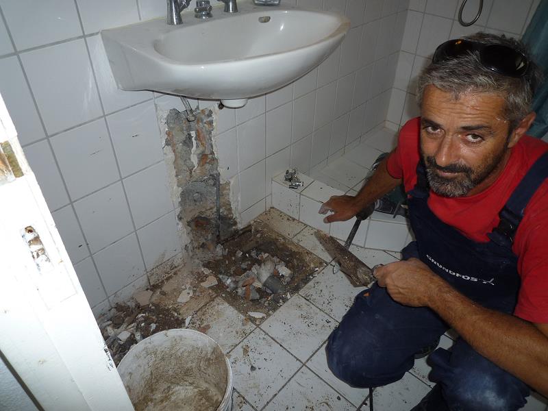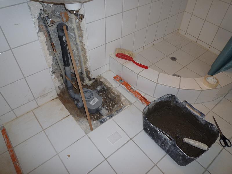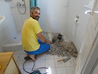 IM GUESTHOUSE HAT’S IM BAD IMMER ZUM BODENABLAUF HINAUS GESTUNKEN. DESHALB DIE SANDSÄCKCHEN. UNSER KLEMPNER ALEX FINDET HERAUS,