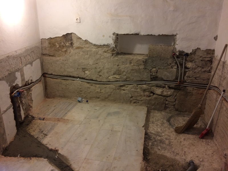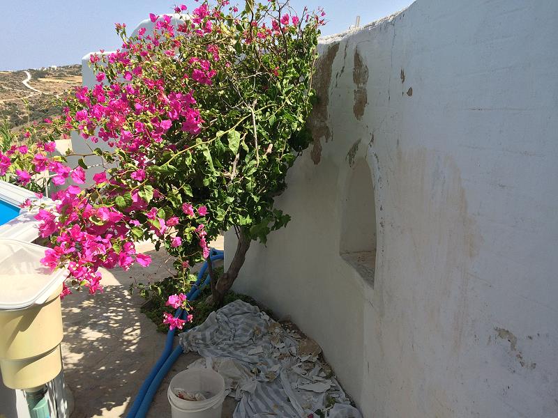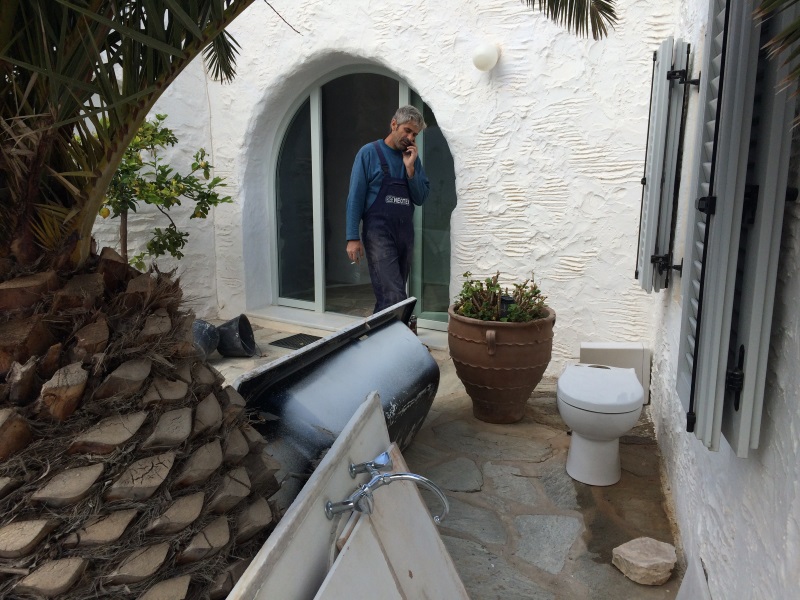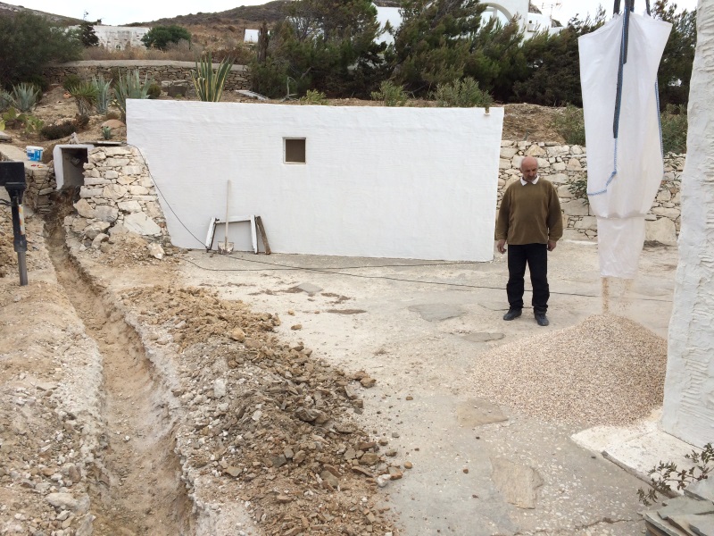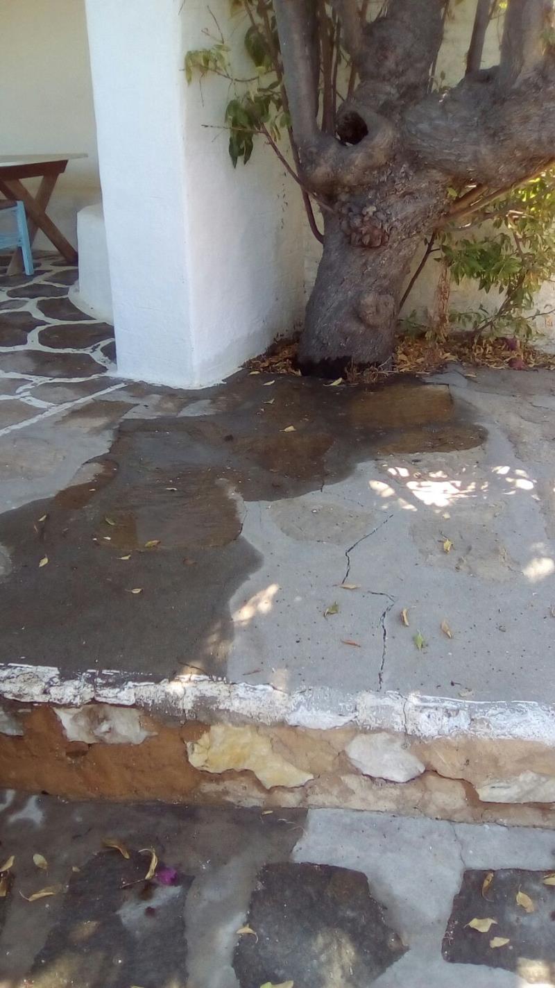 NUN SIND WIR AM 26. OKTOBER WIEDER DA, UM DAS BESTE AUS DEM SCHADEN ZU MACHEN! EIN LANG GEHEGTER WUNSCH, DAS SAUBERE UND TRINKFÄHIGE BERGWASSER DER TIEFENBOHRUNGS-PUMPE SEPARAT INS HAUS EINZU- LEITEN, MÖCHTEN WIR MIT EINEM ZWEITEN WASSERTANK, DER NUR DEN BEIDEN HÄUSER DIENT, TRENNEN VOM WASSER DER BESTEHENDEN ZYSTERNE, WELCHE NUR NOCH DER BEWÄSSERUNG DIENEN SOLL. DIESEN ZWEITEN TANK WIRD VOR UNSERER ANKUNFT DURCH CHRISTINE ORGANISIERT UND DAS “LOCH” IM FELSEN IST FERTIG, ALS WIR NACH PAROS KOMMEN. ES IST EHER ETWAS ZU TIEF GEGRABEN, WIE SICH ZEIGEN WIRD... DIE ERSTEN FOTOS ZEIGEN DEN WASSERSCHADEN UND DIE ARBEITEN ALSO NOCH VOR UNSERER ANKUNFT: |