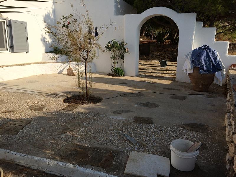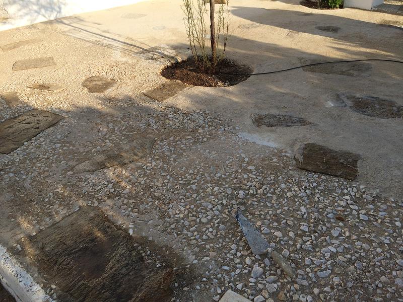 DIE “AUSGEWASCHENEN” MARMORKIES-STEINE DES PLATZES, SPEZIELL VOR DEM GUESTHOUSE, NERVEN. ICH VERSUCHE, DIESE WIEDER IN ZEMENT EINZUBETTEN... |