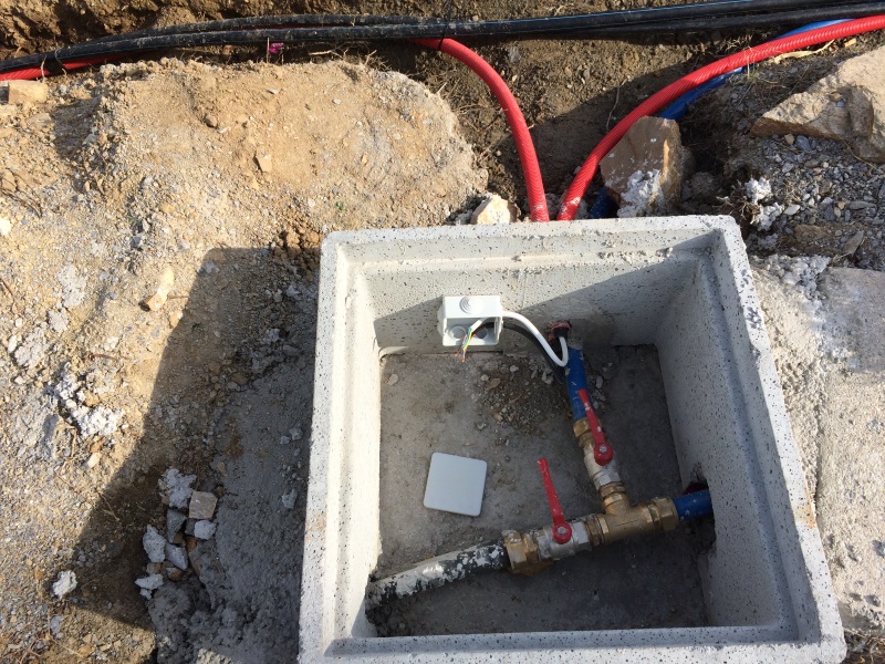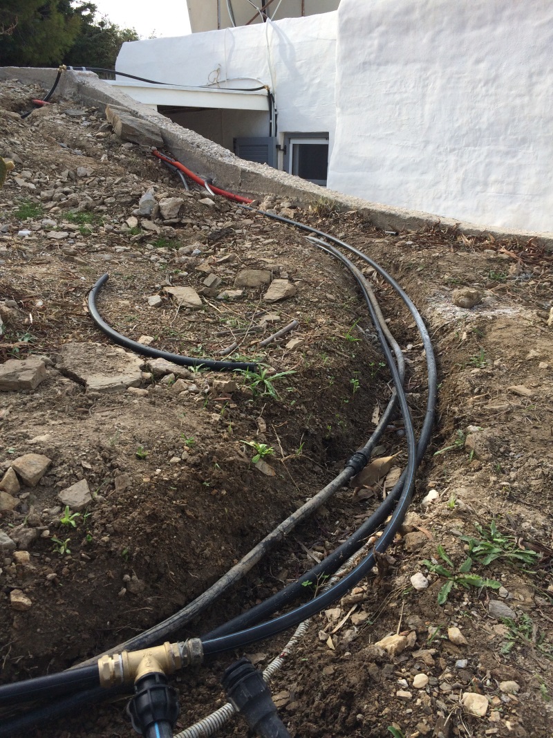GRABEN FÜR DIE NEUEN WASSERLEITUNGEN AB NEUER ZYSTERNE IN BAD UND KÜCHE SOWIE VON DER BESTEHENDEN ZYSTERNE VOR DEM HAUS ZU DEN BEWÄSSERUNGSAUTOMATEN HINTER DEM HAUS |