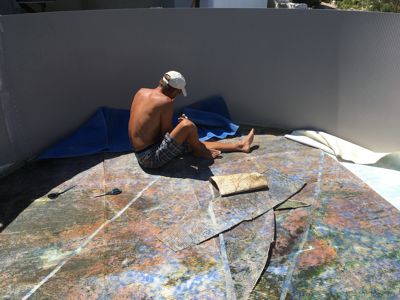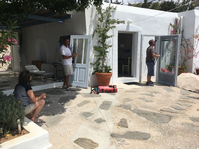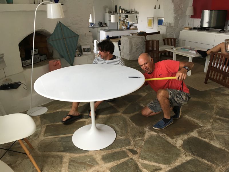 SCHON LANGE HABEN WIR UNS EINEN SCHÖNEN TISCH GEWÜNSCHT, IN PAROS ABER NICHT’S GEFUNDEN. AUF DEN MITGEBRACHTEN SARINENFUSS MONTIERT GIORGOS, DER SCHON DEN PERGOLATISCH UND DIE SIDEBOARDABDECKUNG GEMACHT HAT, EIN TOLLES NAXOS-MARMOR TISCHBLATT. FREUDE HERRSCHT! |