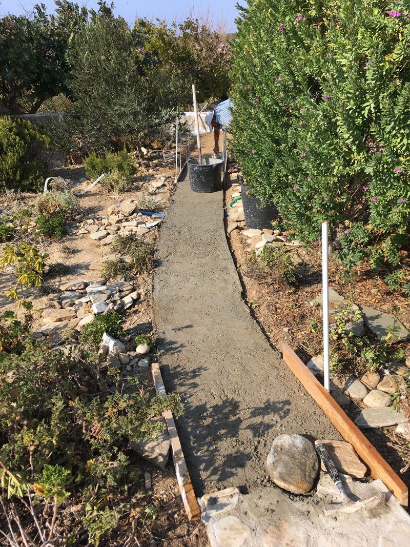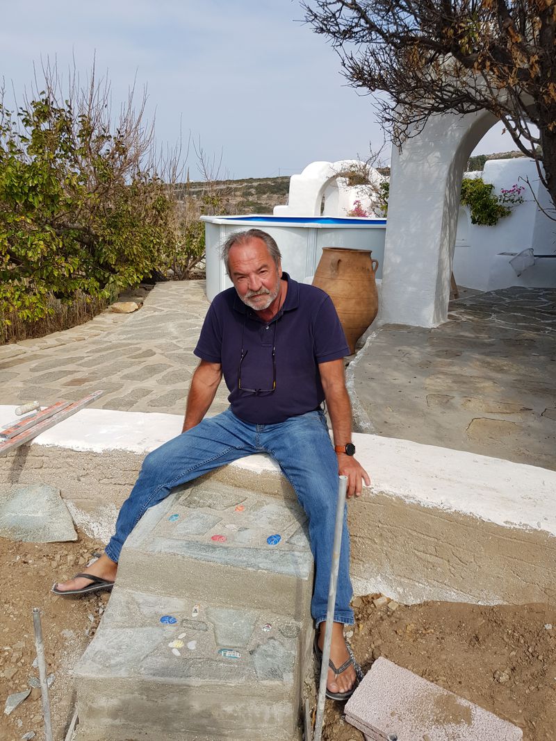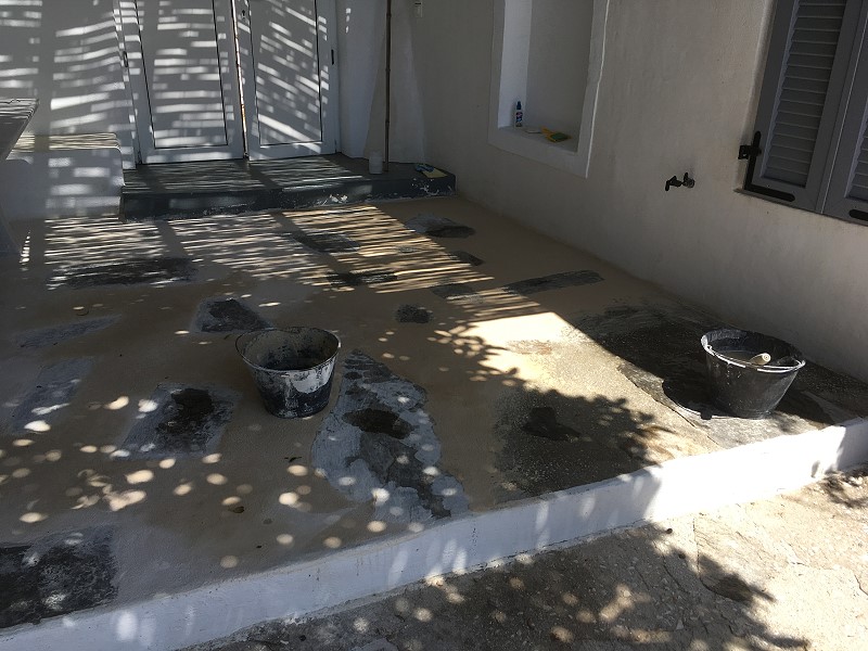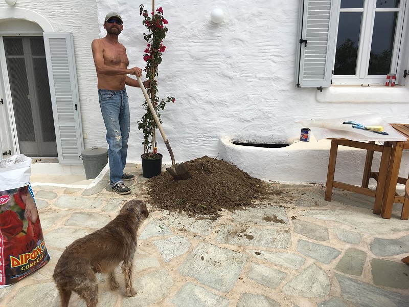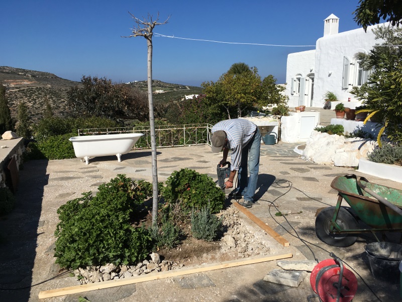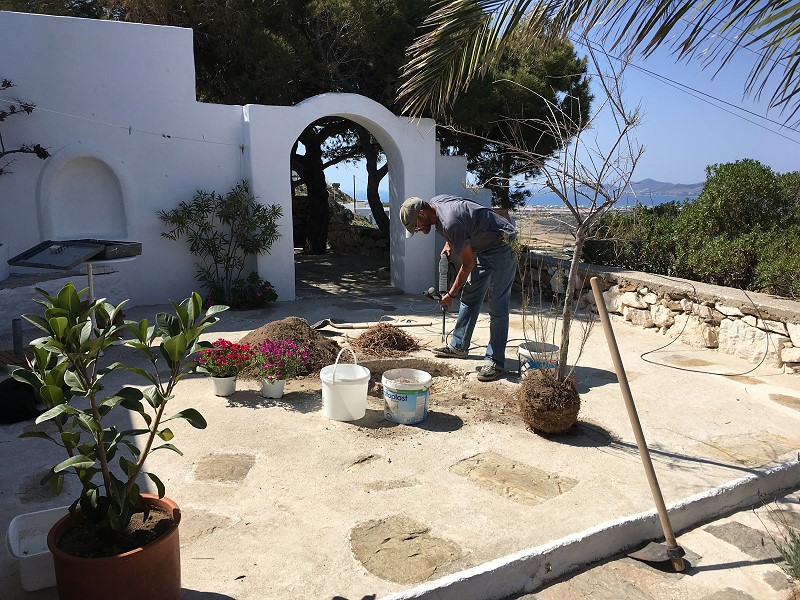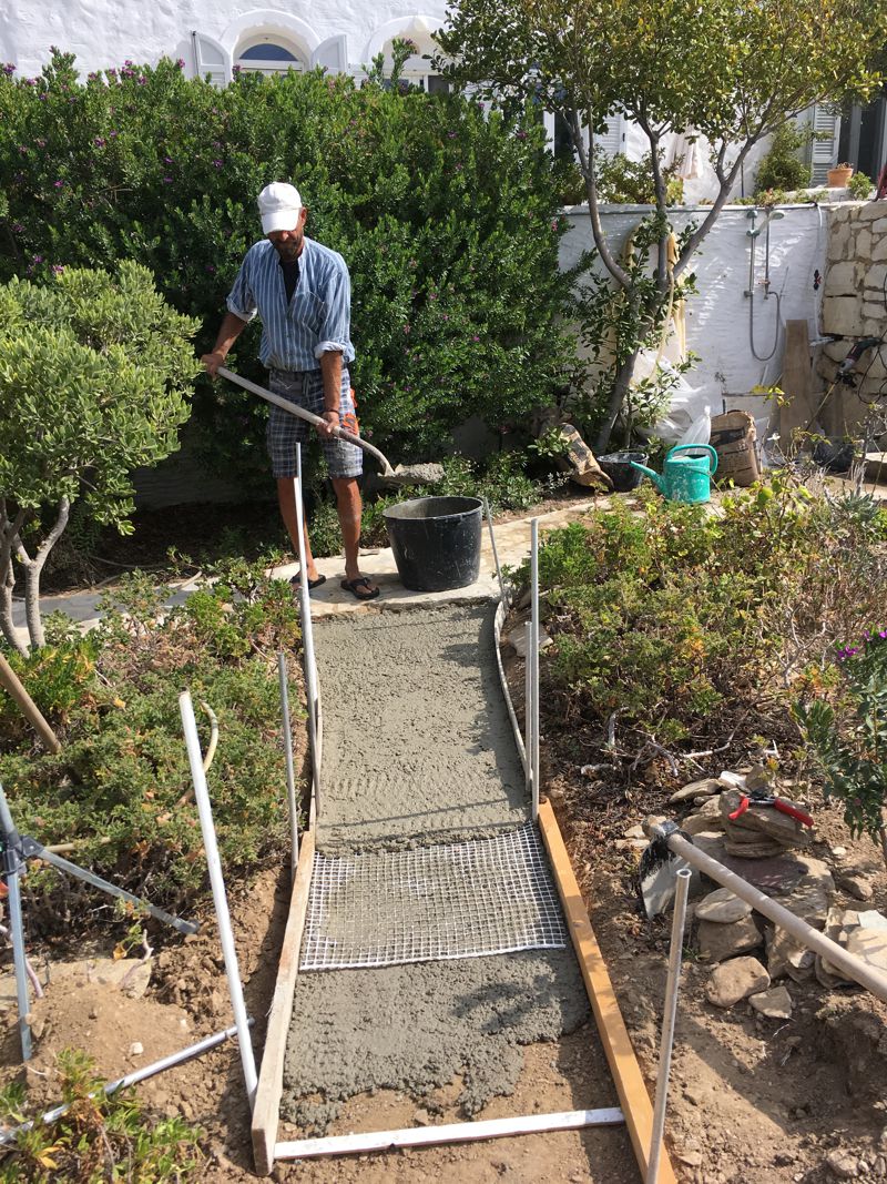 ICH VERSUCHE, DEN AUSGEWASCHENEN PERGOLABODEN FEINER ZU MACHEN. NOCH LEERE AGIA IRINI (ICH IM WASSER!) |