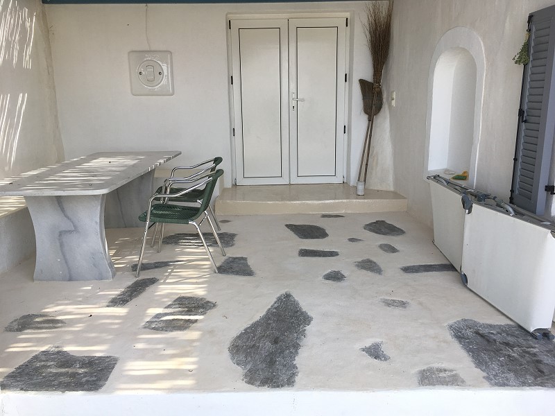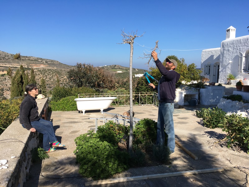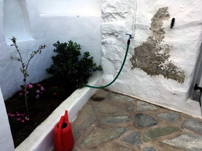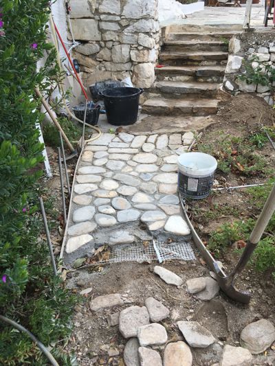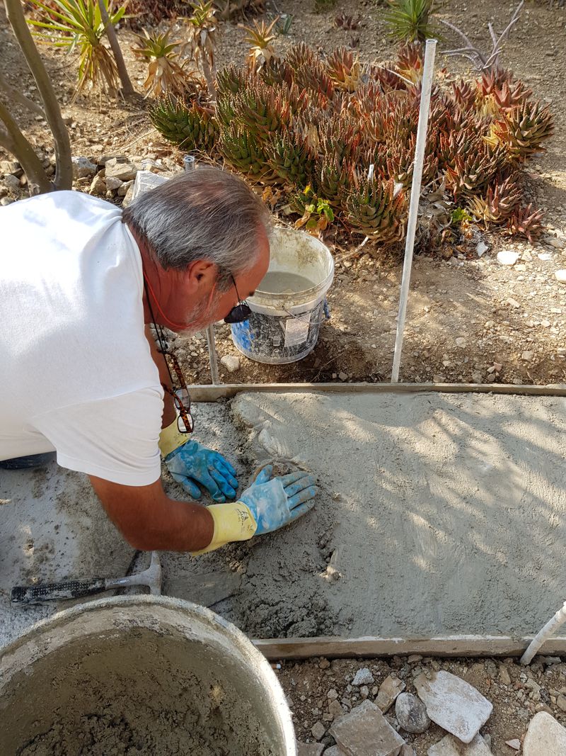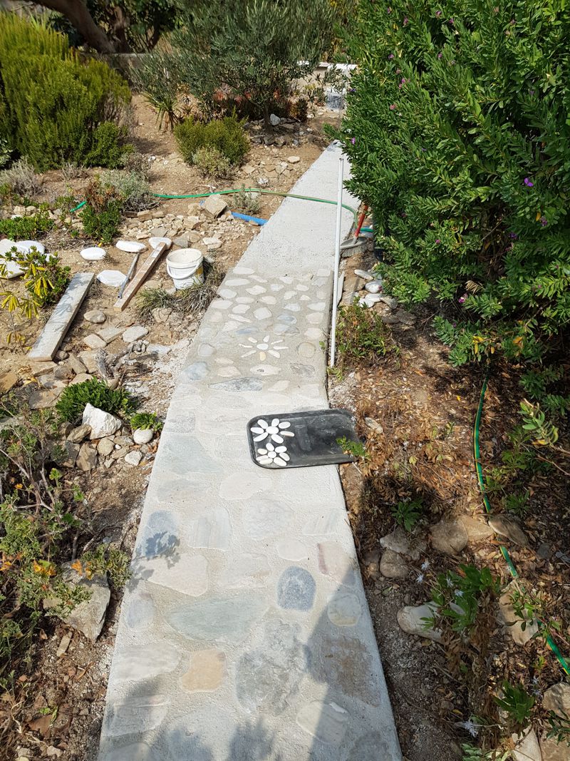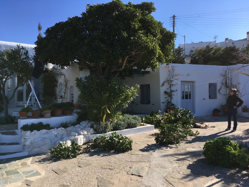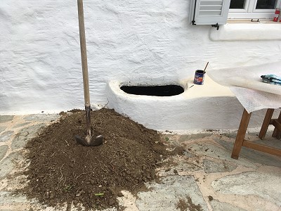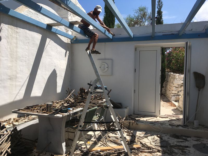 ICH VERSUCHE, DEN AUSGEWASCHENEN PERGOLABODEN FEINER ZU MACHEN. NOCH LEERE AGIA IRINI (ICH IM WASSER!) |
