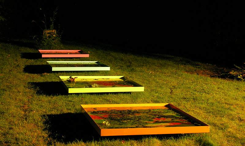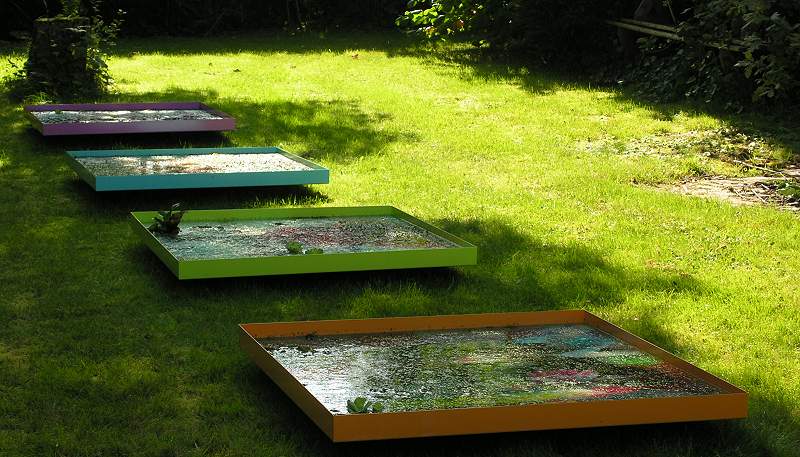Thomas Woodtli: “zwischen Natur und Künstlichkeit”: Airbrush-Glaspattenbilder in Metallwannen unter Wasserpflanzen |
